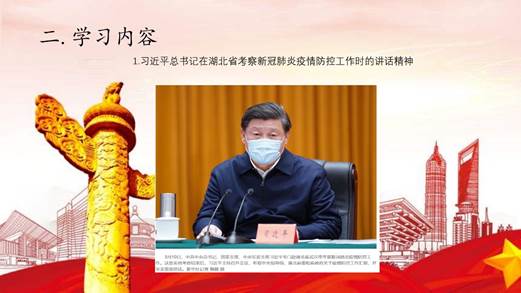 接着,支部负责人郭玉倩带领大家开展了系统的学习,学习了以下内容:学习宣传贯彻习近平总书记在湖北省考察新冠肺炎疫情防控工作时的讲话精神。学习习近平总书记在4月8日召开的中共中央政治局常务委员会会议上的讲话精神。学习中共中央办公厅印发的《党委(党组)落实全面从严治党主体责任规定》学习习近平总书记给北京大学援鄂医疗队全体“90后”党员回信精神。学习《关于开展第32个爱国卫生月活动为全面打赢新冠肺炎疫情阻击战营造良好环境的通知》精神。