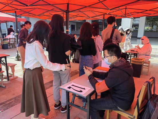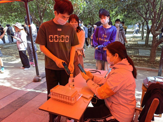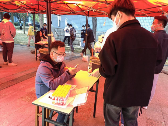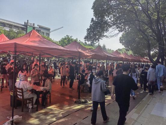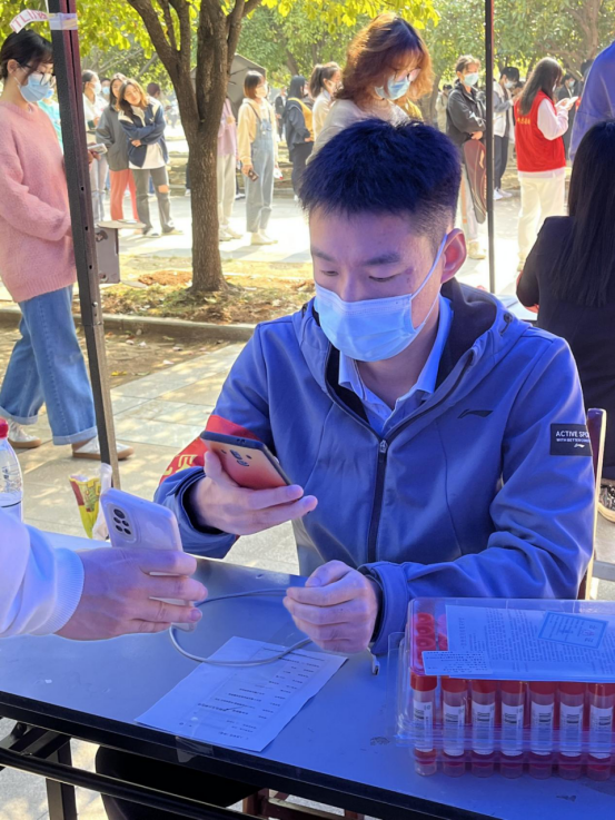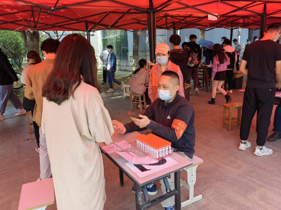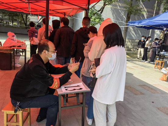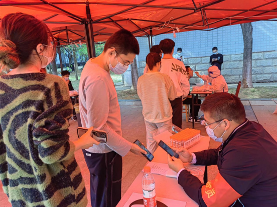 从11:00到13:30,面对源源不断到来的全校师生员工,下沉党员们始终一丝不苟地为师生扫码登记、严格核对身份信息,一刻也不停歇。面对来检测的同学,他们服务热情周到。对待手上的工作,他们严谨细致。他们用辛劳与汗水,以党员的责任担当筑牢校园疫情防控安全防线。