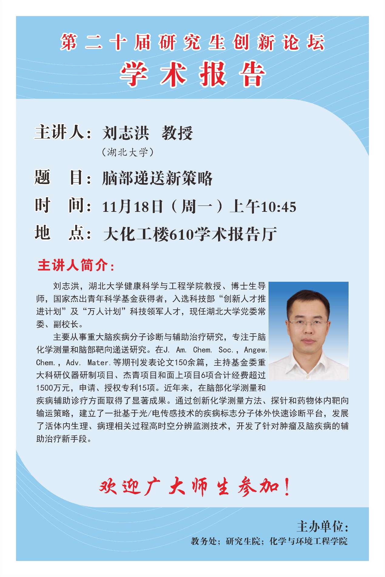 【研究生创新学术论坛】脑部递送新策略 来源:英国365上市公司发布时间:2024-11-17点击率: 主讲人:刘志洪 教授时间:2024年11月18日(周一)上午10:45地点:大化工楼610学术报告厅