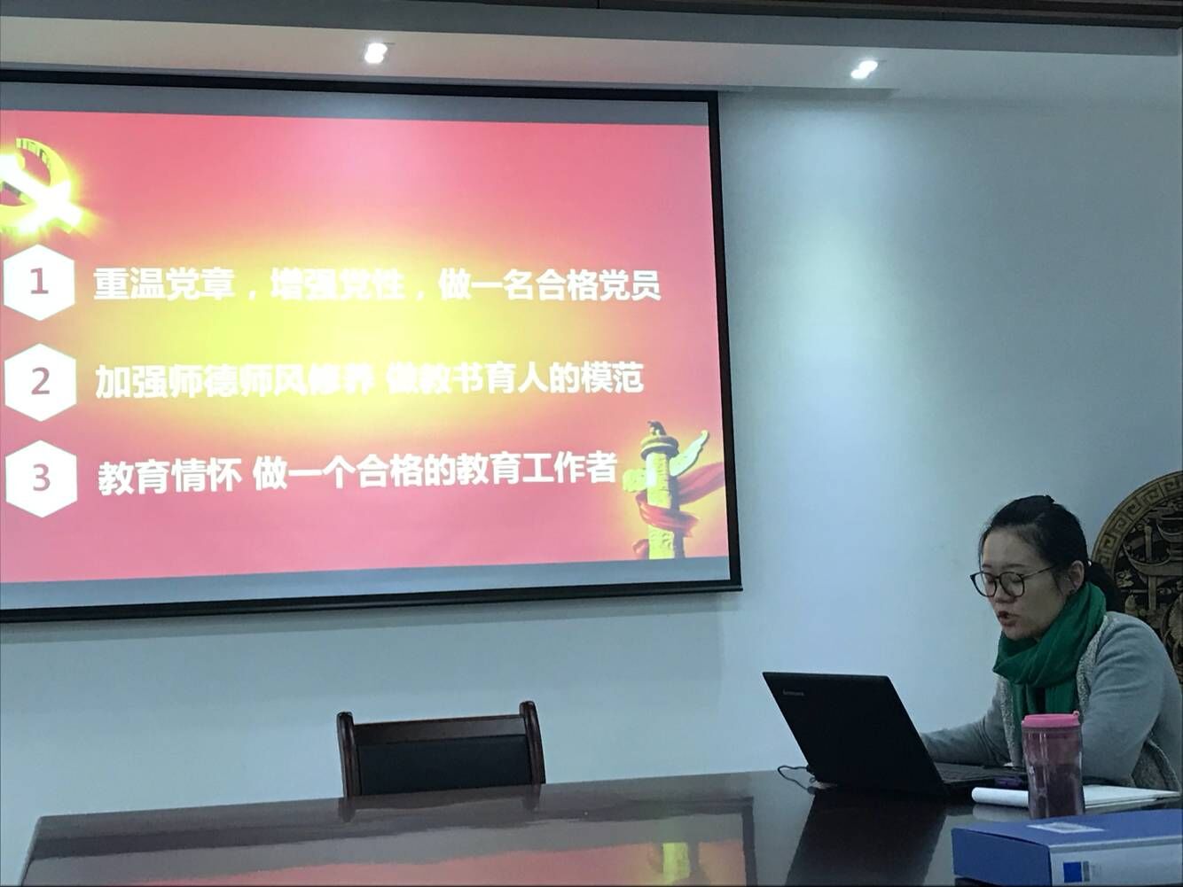 会议首先进行学习培训交流。教职工第一党支部书记程璟以“以党章为镜 抓师德师风 做合格的教育工作者”为题,从用党的理论知识和高校思想政治工作会议讲话精神指导自身工作,推进“两学一做”常态化制度化;加强师德师风建设,履行好教书育人担当和谨记立德树人根本;做一名合格教育工作者三个方面为为全体成员讲述了一堂生动的党课。接着,各支部书记对本支部开展的“两学一做”教育活动常态化制度化情况进行了汇报。