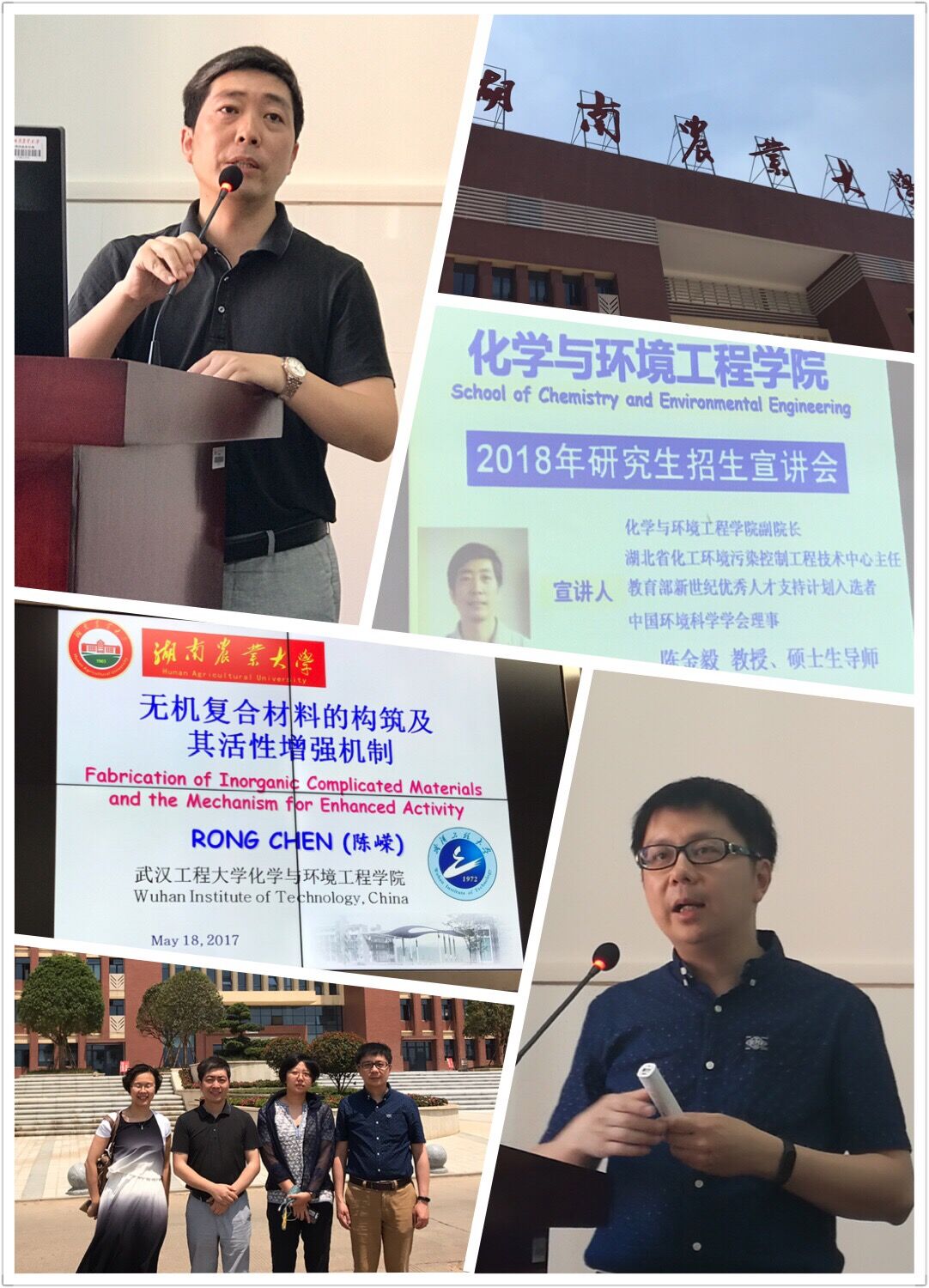 5月18日上午,宣传组一行赴长沙湖南农业大学开展招生宣传工作。分别与湖南农业大学理公司经理周文新教授、副经理李辉勇教授、资源与环境公司经理罗琳教授、硕士生导师们及化学、环境工程等专业本科生进行了面对面交流,并参观了理公司实验室。陈嵘教授面对湖南农业大学理公司化学专业、资源与环境公司环境工程专业本科生做了专题学术报告,并就公司2018年硕士研究生招生政策进行了宣讲。湖南农业大学资源环境公司是具有博士学位授予权的公司,赴湖南农业大学进行硕士研究生招生宣传对于提升公司硕士研究生生源质量具有重要意义。
