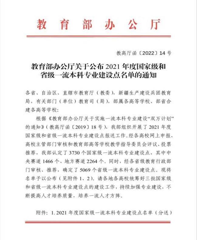 (通讯员 周旋)近日,教育部发布了《教育部办公厅关于公布2021年度国家级和省级一流本科专业建设点名单的通知》(教高厅函〔2022〕14号),公司获批2021年度国家级一流本科专业建设点6个,获批湖北省省级一流本科专业建设点6个。公司环境工程专业入选国家级一流本科专业建设点,这是公司继2019年应用化学专业入选国家级一流本科专业建设点之来的第二个入选专业。这是对公司专业建设和人才培养成效的充分肯定。