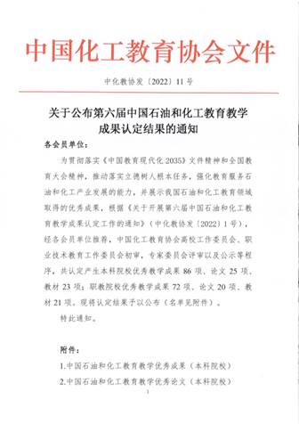 (通讯员王刚)近日,中国化工教育协会发布了《关于公布第六届中国石油和化工公司产品成果认定结果的通知》(中化教协发[2022]11号),公司有机化学教研室孙琦博士申报的“基于绿色低碳理念的有机化学设计实验的探索与实践”获本科院校优秀教学成果二等奖。