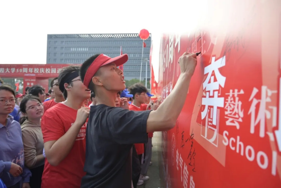 跑完迷你马拉松后,同学们纷纷上前在设有的活动纪念版上签名留念