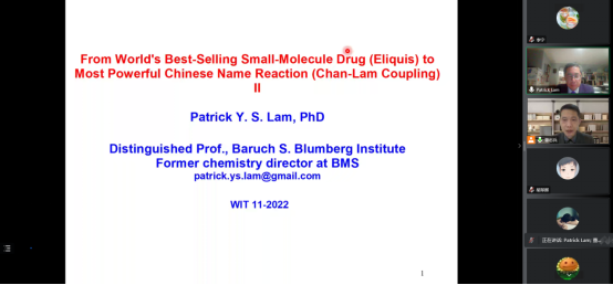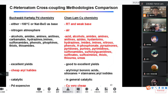 2022年11月28日Patrick Lam教授以《Copper-promoted oxidative C-X bond cross-coupling via boronic acids: Chan-Lam Oxidative Coupling》为题,详细讲述了新型的铜促进的C-N和C-O键交叉偶联反应。Patrick Lam教授通过使用含有硼酸基团的底物,在铜催化下对胺或带有羟基的化合物实现了一系列的C-X键的交叉偶联,并对机理做出了一系列的探讨。Patrick Lam教授不仅发现了“Open-Flask”Cu促进的C-X键氧化交叉偶联方法,并对荣获了诺贝尔化学奖的Suzuki-Miyaura偶联反应实现了有效的补充,对有机化学领域的进一步发展做出了重要贡献。