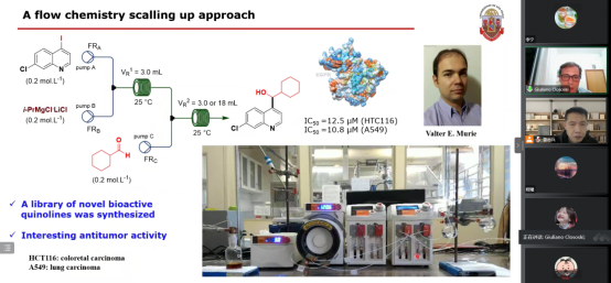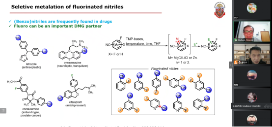 Giuliano Clososki教授以《Selective functionalization of medicinally privileged aromatic scaffolds》为题,详细讲述了其课题组在具有药用价值的芳香骨架的选择性功能化方面的研究进展。他们提出碱控制氯取代喹啉类化合物的区域选择性官能化,并利用具有特定选择性的金属化策略实现了一系列化学选择性修饰。其团队通过使用导向金属化基团实现了一系列选择性芳香官能化、氟化腈的选择性金属化。会后,老师和同学们针对自己的兴趣点与Giuliano Clososki教授进行详细的交流,整个报告内容充实、详尽,同学们收获颇丰。