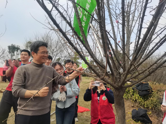 在许守飞带领下,全体辅导员与员工志愿者代表身着统一志愿者服装,分工协作、干劲十足。挥锹铲土、扶苗培土、提水浇灌……师生们默契配合,将一棵棵新苗稳稳扎根土壤。植树过程中,公司党委书记汪伟亲临公司植树区域,为公司栽种的树苗挂牌。汪伟对公司师生的积极参与表示肯定,并强调:“每一株树苗都是绿色校园的见证者,更是师生情谊与奋斗精神的象征。”