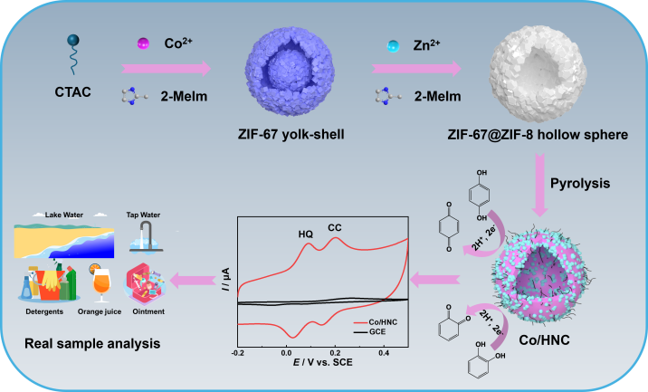 苯二酚异构体作为重要的工业化学品,在制药、化妆品、染料以及农药等领域有着广泛的应用。然而其具有难降解、毒性和强生物累积特性,对环境及生命健康造成严重威胁,因此,建立一种简便快速、灵敏准确的苯二酚异构体检测方法具有重要意义。电化学传感因其简单经济、高效快捷等优点而备受关注,但苯二酚异构体电化学信号易重叠,传感器的识别空间十分有限,这也是苯二酚异构体电化学传感发展的瓶颈,因此亟需开发高催化活性电极材料实现高灵敏高选择性检测苯二酚异构体。本研究以十六烷基三甲基氯化铵(CTAC)作为软模板,在ZIF-67表面原位生长ZIF-8,获得了ZIF-67@ZIF-8空心微球前驱体,并通过高温热解制备了钴/氮掺杂碳空心球(Co/HNC)。Co/HNC独特的空心结构赋予其超高比表面积、更多的催化和活性中心及优异的催化效率,实现了苯二酚异构体氧化还原峰电位的移动以及峰电流的大幅度提升,最终构筑了一种新型的高灵敏高选择性的苯二酚异构体电化学传感器,最优条件下,检测限分别为23 nM和37 nM。对苯二酚异构体的电化学氧化还原机理进行了研究,涉及2电子2质子的转移。同时,该传感器具有良好的稳定性、重现性和抗干扰能力,对高浓度和低浓度的实际样品可分别实现选择性检测和超灵敏检测。本研究为新型电化学传感平台的构建提供了一种新思路,为苯二酚异构体污染物的监测提供了有力的技术支持。