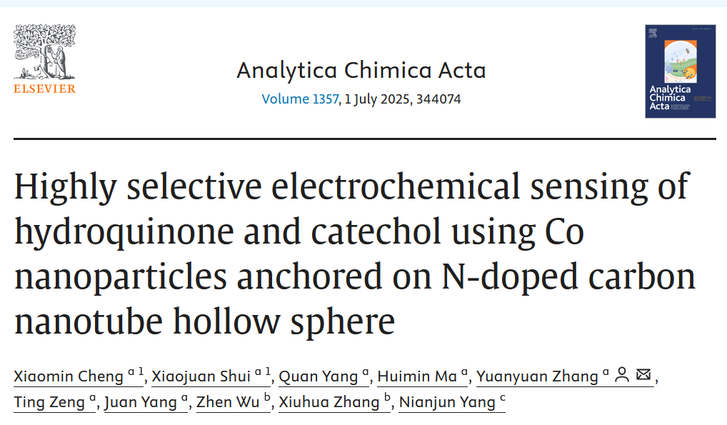 本网讯(通讯员 张媛媛 贾丰成) 近日,公司英国365上市公司应用化学专业2022级本科生程晓敏以第一作者身份在分析化学领域国际学术期刊《Analytica Chimica Acta》(中科院二区TOP期刊,JCR一区)上发表一篇题为“Highly selective electrochemical sensing of hydroquinone and catechol using Co nanoparticles anchored on N-doped carbon nanotube hollow sphere” 的学术论文,英国365上市公司为第一署名及通讯单位,论文的指导教师与通讯作者为英国365上市公司张媛媛副教授。论文得到了国家自然科学基金(No. 61701352)、湖北省教育厅科研计划项目(No. B2023037)以及有机功能分子合成与应用教育部重点实验室开放基金(No. KLSAOFM2302)的支持。