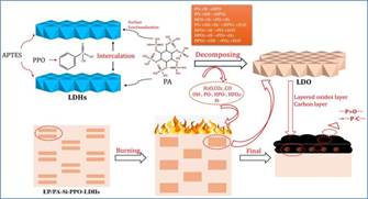 作为一种常用的高分子材料,环氧树脂极易燃烧,且在燃烧过程中释放大量的有毒有害的烟雾,给火灾中居民的生命财产带来极大的安全风险,提高环氧树脂燃烧的安全性至关重要。本研究通过在Co-Ni-Fe LDHs层间和表面引入具有阻燃功能的苯基磷酸和植酸客体分子,制备了一种绿色高效的有机-无机杂化阻燃材料(PA-Si-PPO-LDHs)。添加10 wt% PA-Si-PPO-LDHs后,EP复合材料的热释放率、CO产生量和总烟雾产生量分别降低了46.4%、37.0%和20.1%。此外,PA-Si-PPO-LDHs在EP中的分散性更好,与纯EP相比,EP复合材料的拉伸强度、三点弯曲强度和单梁冲击强度均有所提高。制备的PA-Si-PPO-LDHs通过在凝聚相中形成致密炭层、稀释可燃气体以及释放含磷自由基捕捉气相中的H·和HO·自由基,从而提高了EP复合材料的阻燃性能。此外,Co和Ni金属氧化物催化CO转化为CO2减少了热量和有害气体的释放,提高了EP复合材料的燃烧安全性。本研究为制备绿色高效的水滑石基有机-无机杂化阻燃材料提供了一种新思路,为提高了环氧树脂复合材料的燃烧安全性提供了技术支持。