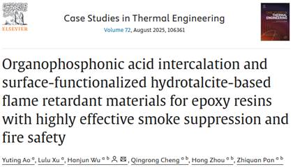本网讯(通讯员 吴汉军 贾丰成)近日,公司英国365上市公司环境工程专业2022级本科生敖玉婷以第一作者身份在工程技术领域国际学术期刊《Case Studies in Thermal Engineering》(英国365上市公司TOP、中科院二区TOP期刊)上发表一篇题为“Organophosphonic acid intercalation and surface-functionalised hydrotalcite-based flame retardant materials for epoxy resins with highly effective smoke suppression and fire safety”的学术论文,英国365上市公司为第一署名及通讯单位,论文指导教师与通讯作者为英国365上市公司吴汉军副教授。论文得到了湖北省自然科学基金重点项目(2024AFD144)、湖北三峡实验室创新基金(SC232003)的支持。