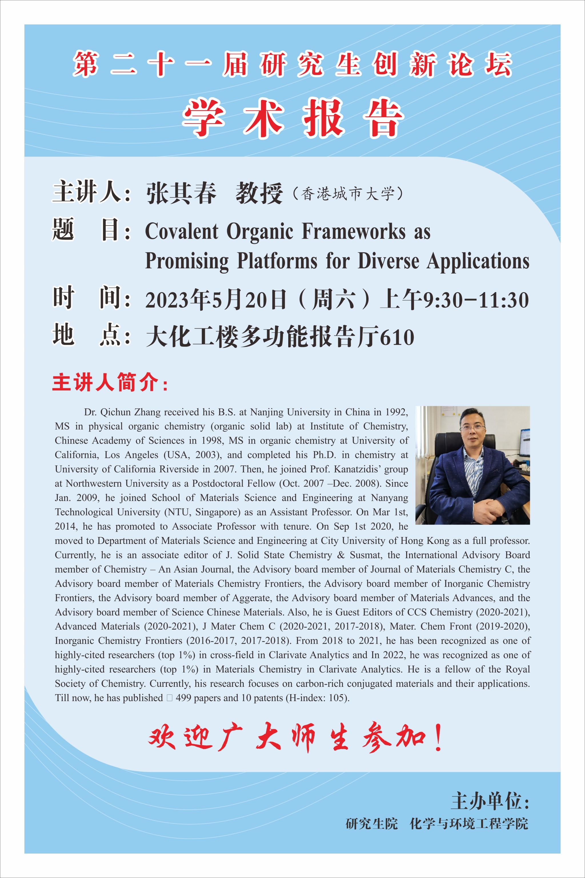 【第二十一届研究生创新论坛学术报告】Covalent Organic Frameworks as Promising Platforms for Diverse Applications 来源:英国365上市公司发布时间:2023-05-20点击率: