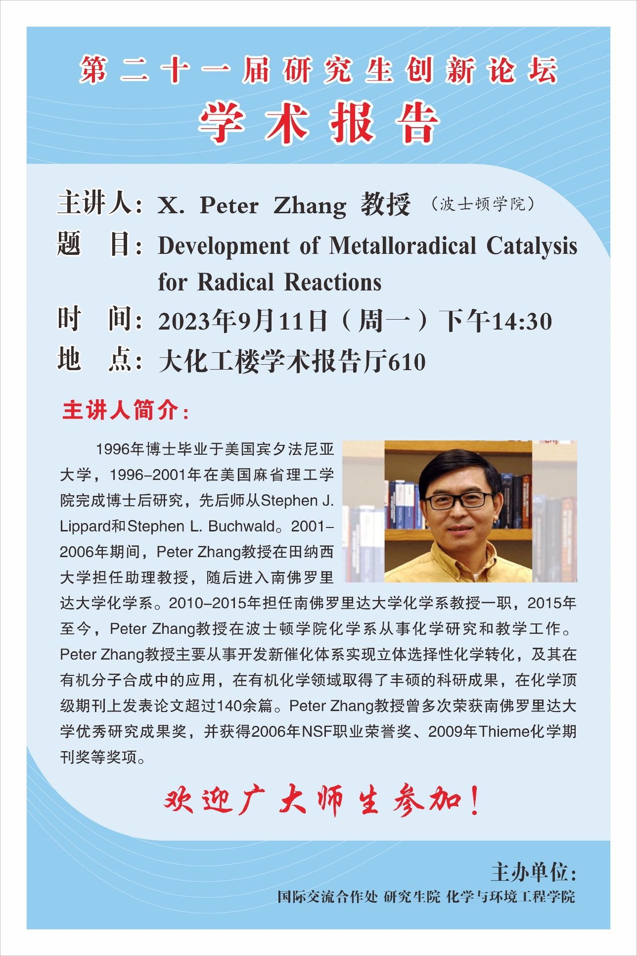 【第二十一届研究生创新学术论坛】Development of Metalloradical Catalysis for Radical Reactions 来源:英国365上市公司发布时间:2023-09-08点击率: