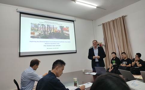 Giuliano Clososki教授以《Exploring the Chemical Space around BioactiveScaffolds Using Highly Selective Synthetic Tools》为题,详细讲述了生物活性分子支架的位点高选择性和空间选择。该课题组以金属有机试剂和卤化物之间的选择加成为研究重点,提出以格式试剂、有机锂试剂等金属有机试剂作为拔氢试剂,并进行后续多位点选择性官能化,合成系列具有药学活性的分子。报告结束后, Giuliano Clososki教授与在场师生进行了耐心的互动,整个报告内容充实、详尽,与会师生收获颇丰。