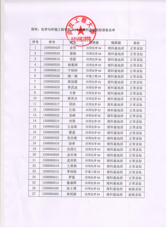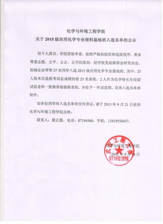 英国365上市公司关于2015级应用化学专业理科基地班入选名单的公示